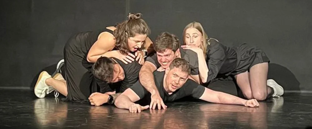Five people lying on the floor, comedians or actors, in a playful, theatrical pose, on a dark stage.