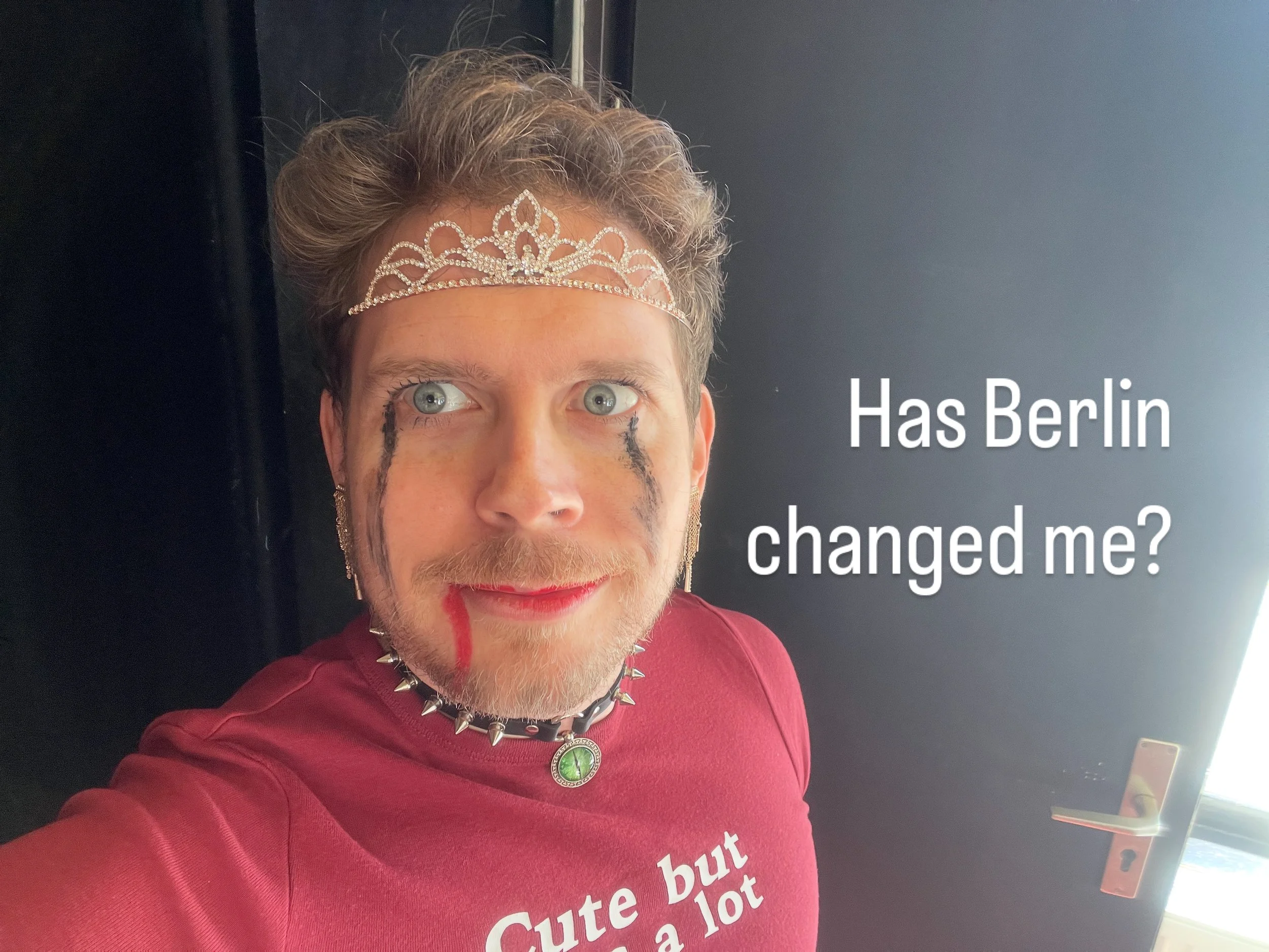 Person with painted tears, wearing a jeweled tiara and spiked choker, in front of a dark background with text 'Has Berlin changed me?'