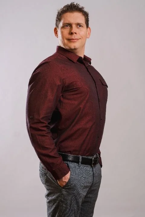 A man standing sideways with his hand in his pocket, wearing a maroon button-up shirt and gray pants, against a plain light gray background.